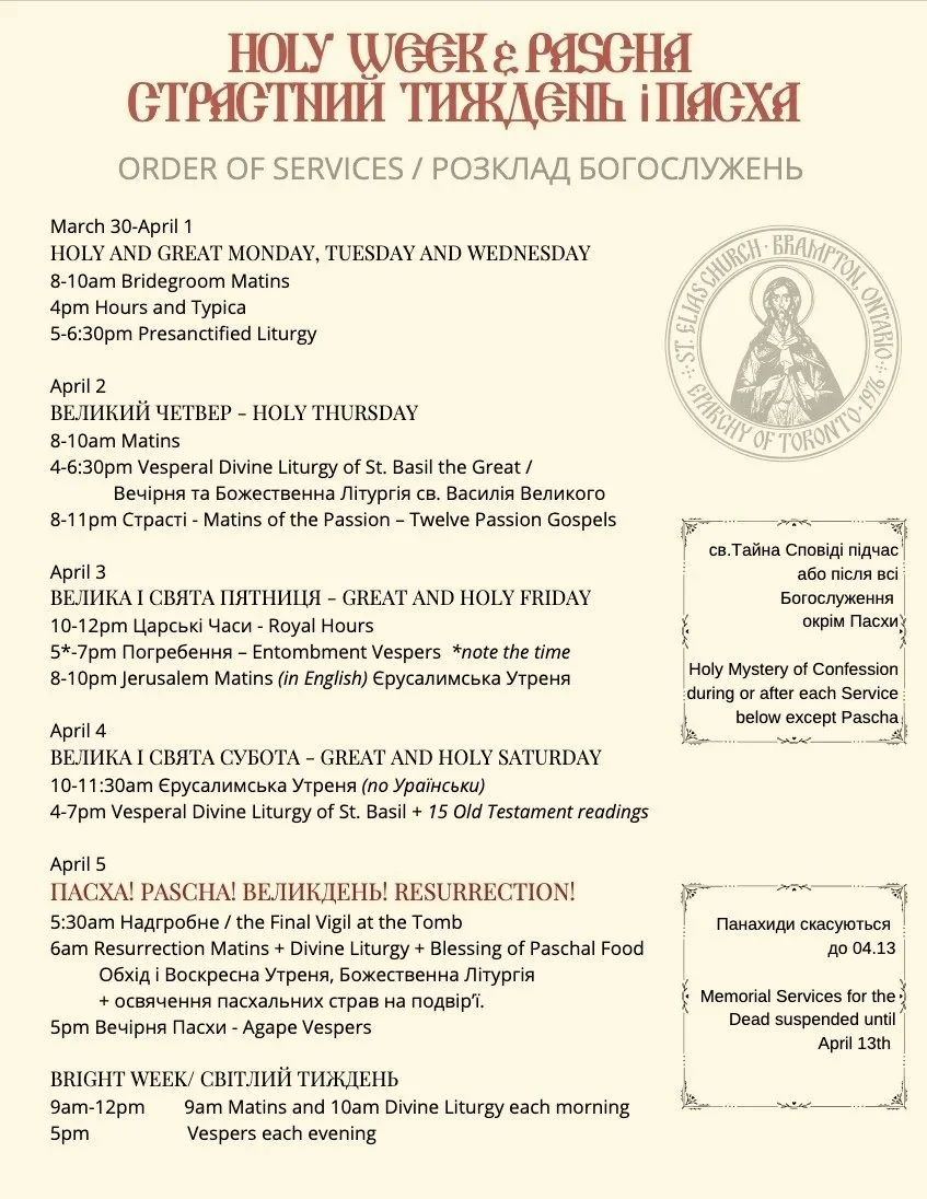 For weekday, Holy Day+ Great Lent services see the parish calendar (linked below) Usual schedule is Vigil on the eve of the feast and Divine Liturgy on the Morning of the Feast. Our Parish is on the Revised Julian Calendar (Christmas on the New Gregorian Calendar Easter on the Old Julian Calendar)